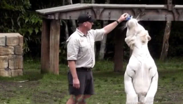 白虎远远的看到饲养员的手里拿了一盒牛奶,眼睛就一直直勾勾的盯着他,等到饲养员来到自己面前的时候,这头白虎居然一下子坐直了身体,两只前爪捧在身体前面,就好像是狗狗在讨要食物时候作揖一样。这样的动作把白虎园外的游客都引的哈哈大笑。