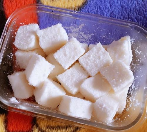 接下来我们就需要把它给晾到常温的状态,然后放在冰箱里面冷藏了,然后等到它完全凝固的时候,我们需要把它的切成小块,并且撒上一些椰蓉,那么这样的一个牛奶小方就做好了。其实对于这样的一个牛奶小方口感真的是奶香味十足,而且是特别嫩滑可口的,上桌之后孩子都会抢着吃。