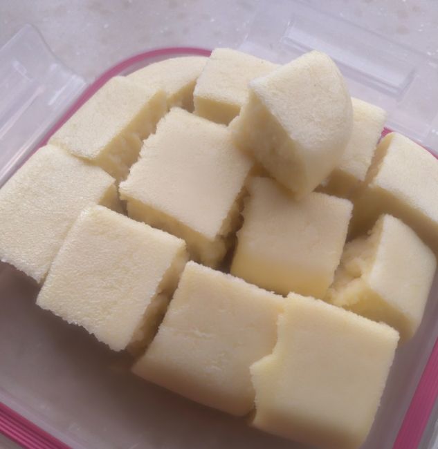 步骤3、起锅,倒入适量的清水,用大火烧开,将容器上锅蒸20分钟。时间到了后,将容器取出来,放凉后就很容易脱模,用刀切成小块后,装入盘中,【牛奶蒸蛋糕】就做好了。